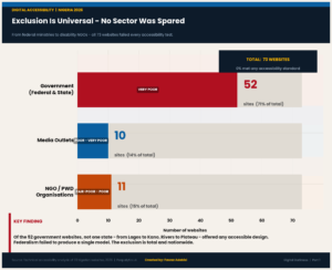 To understand the scope of this exclusion, working closely with an Artificial Intelligence and Machine Learning engineer, Samuel Kalu, who works at Peepalytics AI, a comprehensive technical analysis was conducted on 73 Nigerian websites spanning government services, media outlets, and civil society organisations, including those specifically serving persons with disabilities.