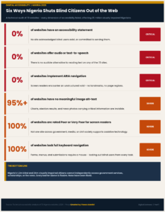 When the Independent National Electoral Commission (INEC) website is inaccessible, blind citizens cannot independently register to vote, verify their registration status, or find their polling units. When state government portals fail to provide accessible information, blind citizens cannot track public services, access state programs, or engage with local governance.